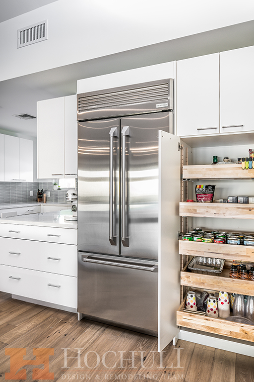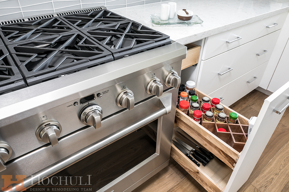 White slab front cabinets with plenty of convenience pull-outs