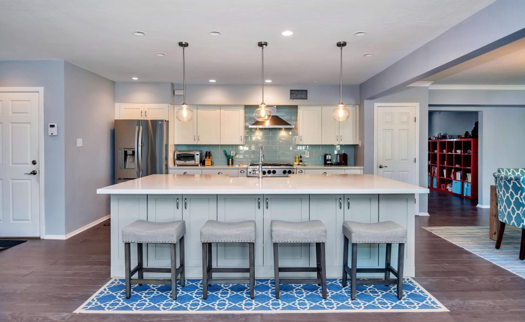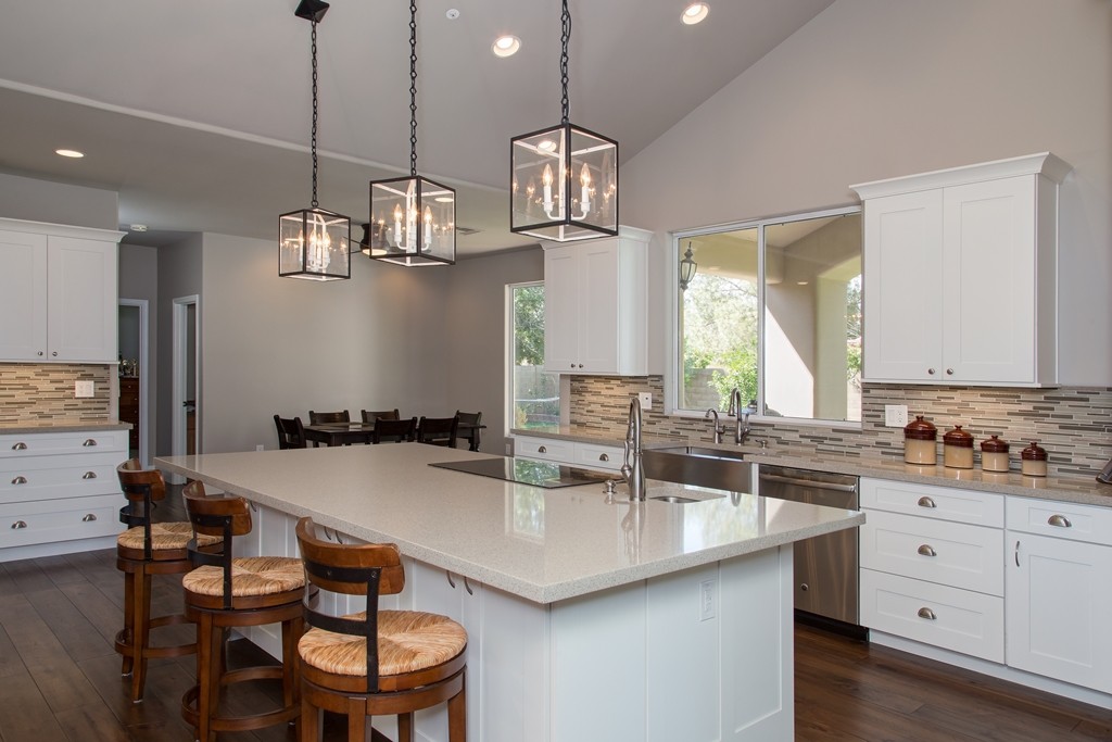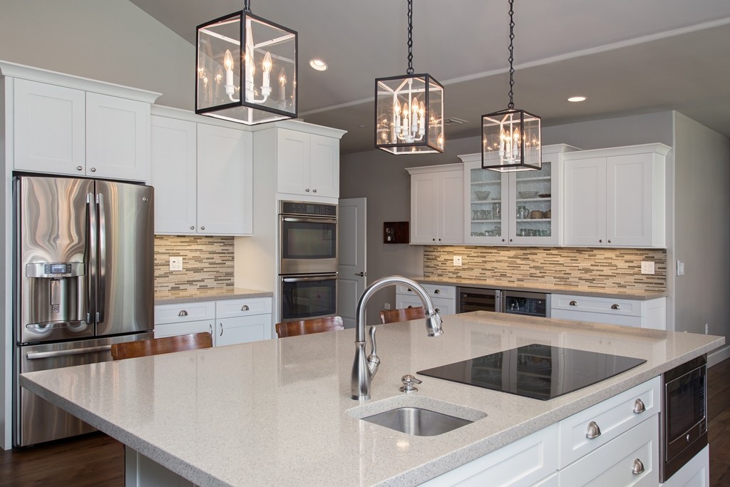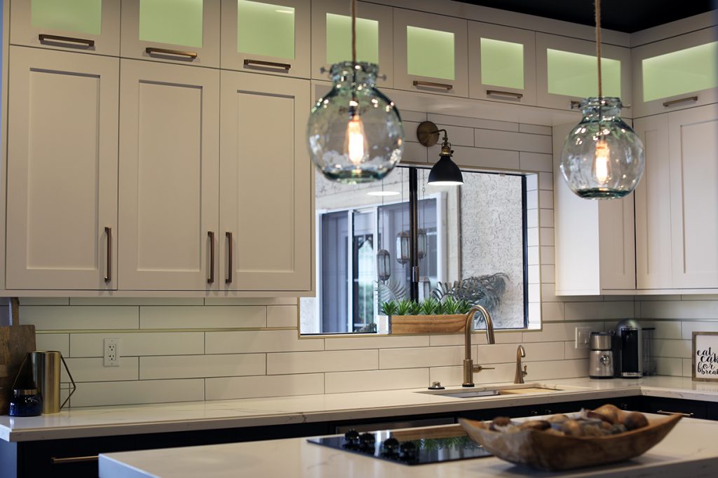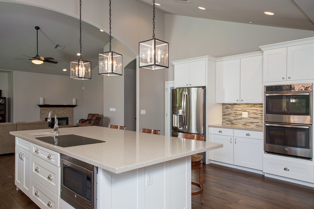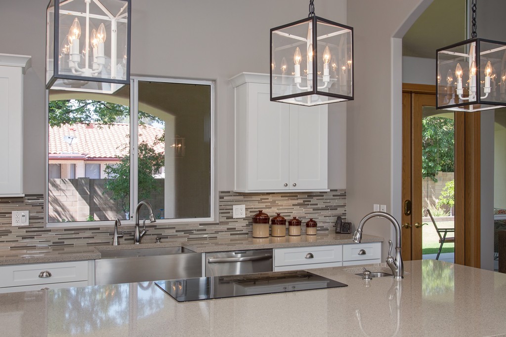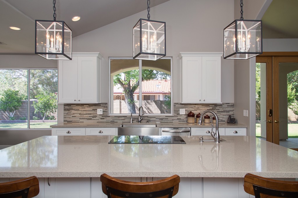 Specialty glass pendant lighting, white cabinets, quartz countertops, stainless appliances in kitchen remodeling project by hochuli design & remodeling team in gilbert, arizona.