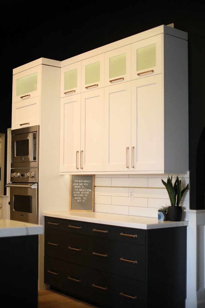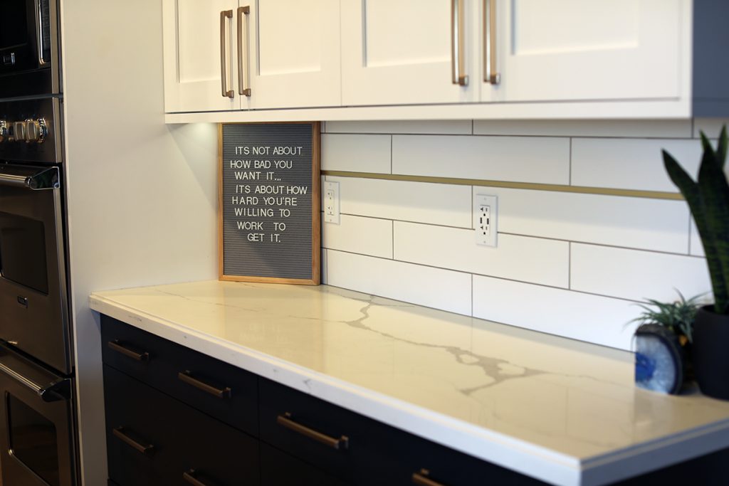 A good mixture of white cabinets, quartz countertops, white subway tile with gold schluter trim, and white oak bottom cabinets stained black.