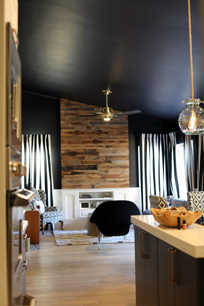 Walls and Ceiling that have been painted black in this Kitchen Remodeling project. The black paint highlights the white shaker cabinets and french white oak wood flooring.