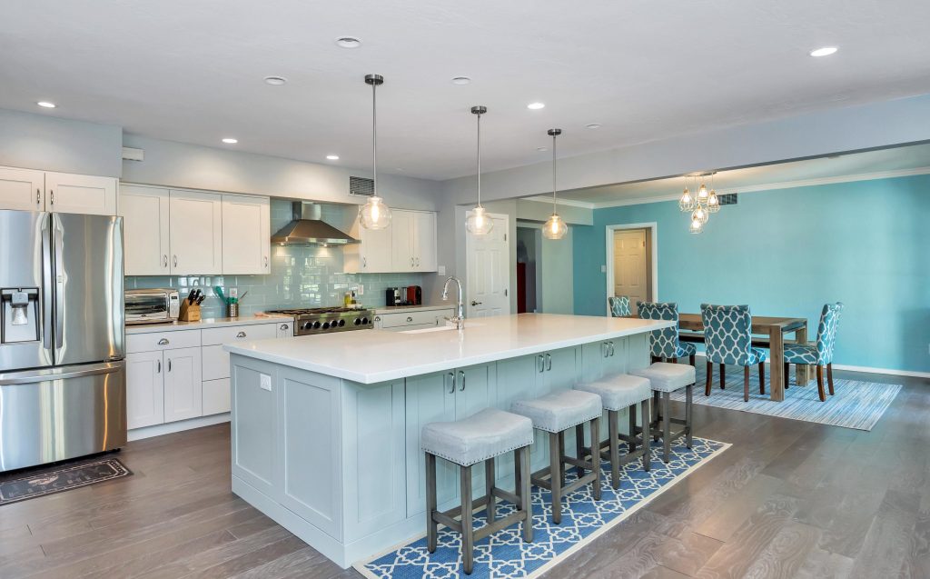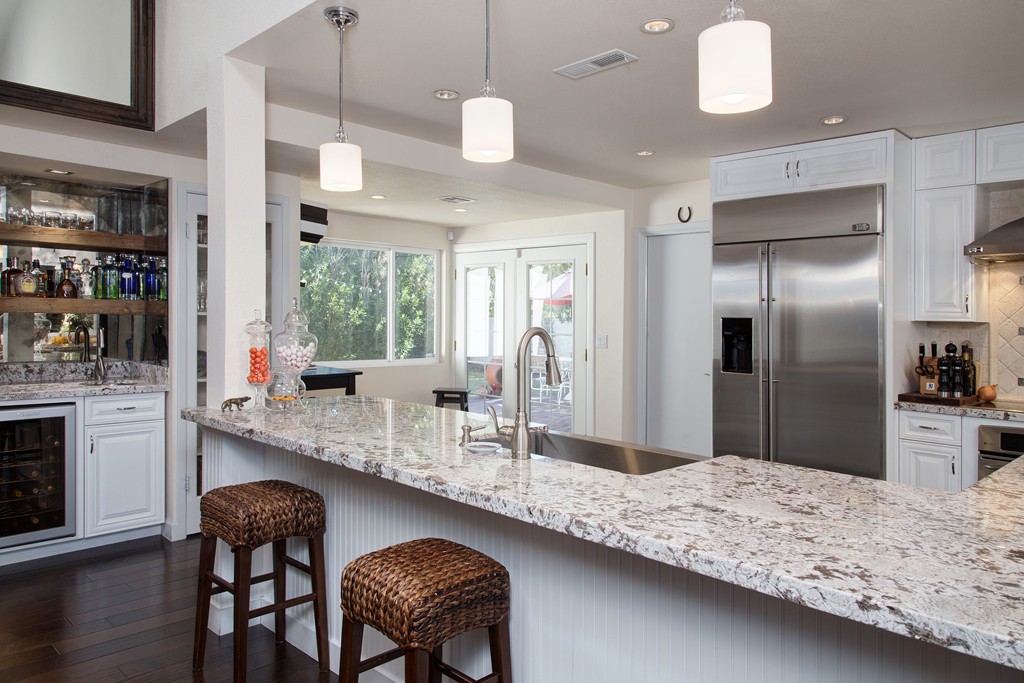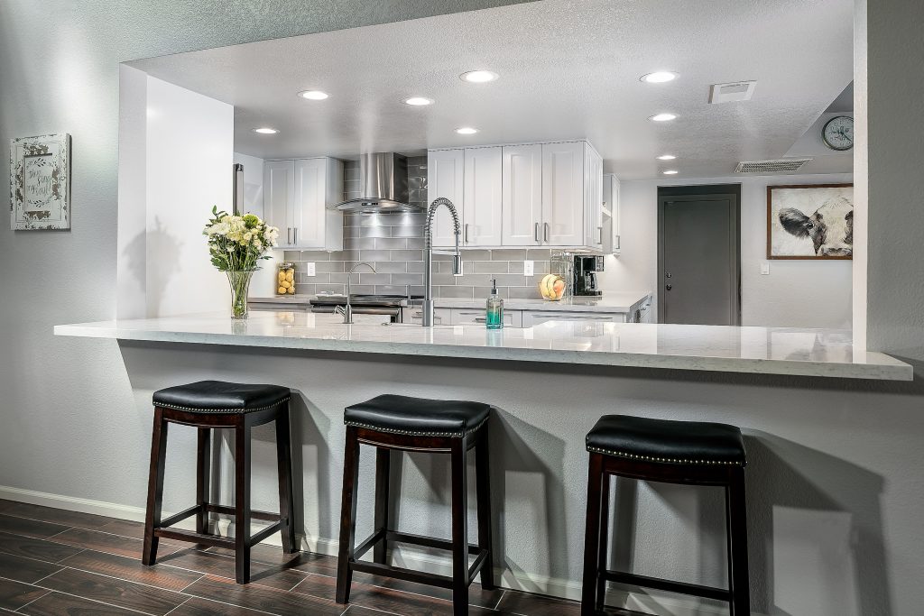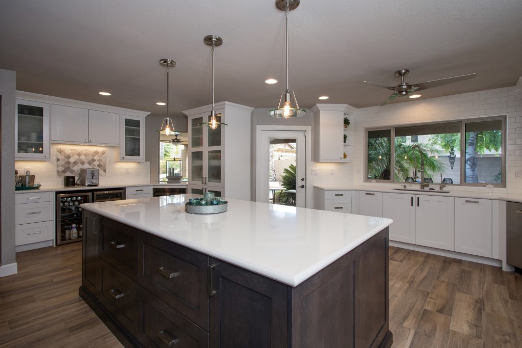Kitchen remodel completed in Phoenix, AZ featuring an island with extra seating and counter space for hosting events.