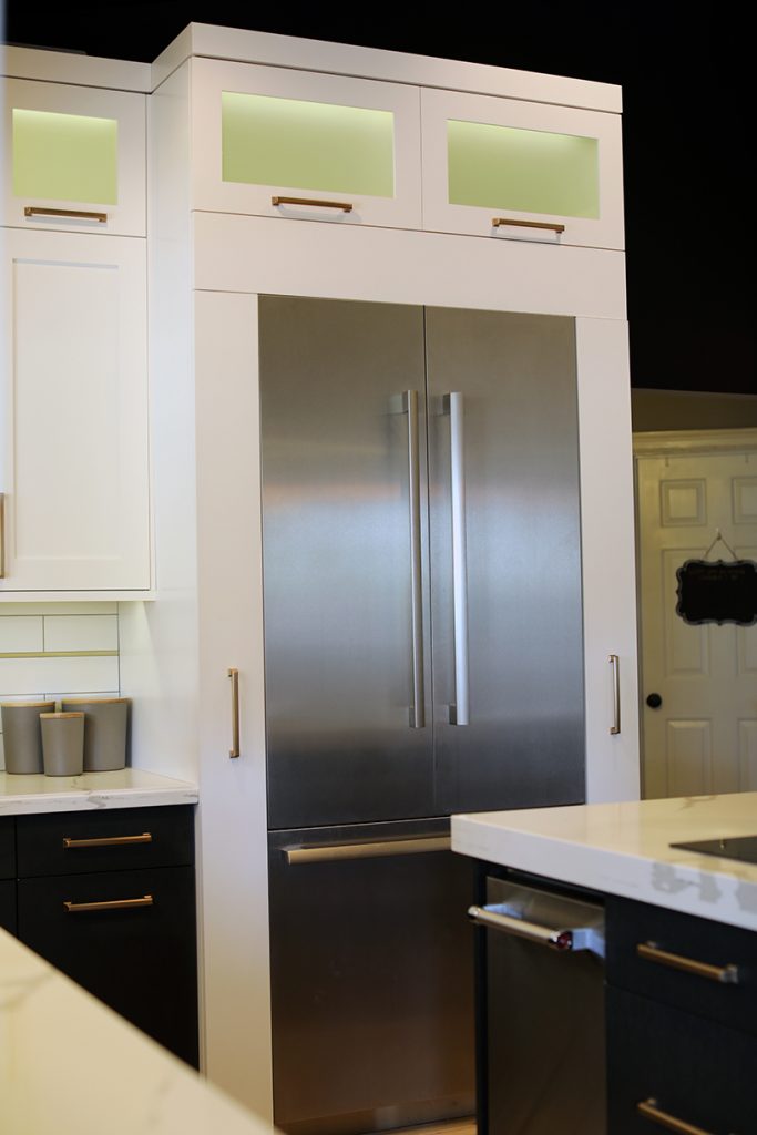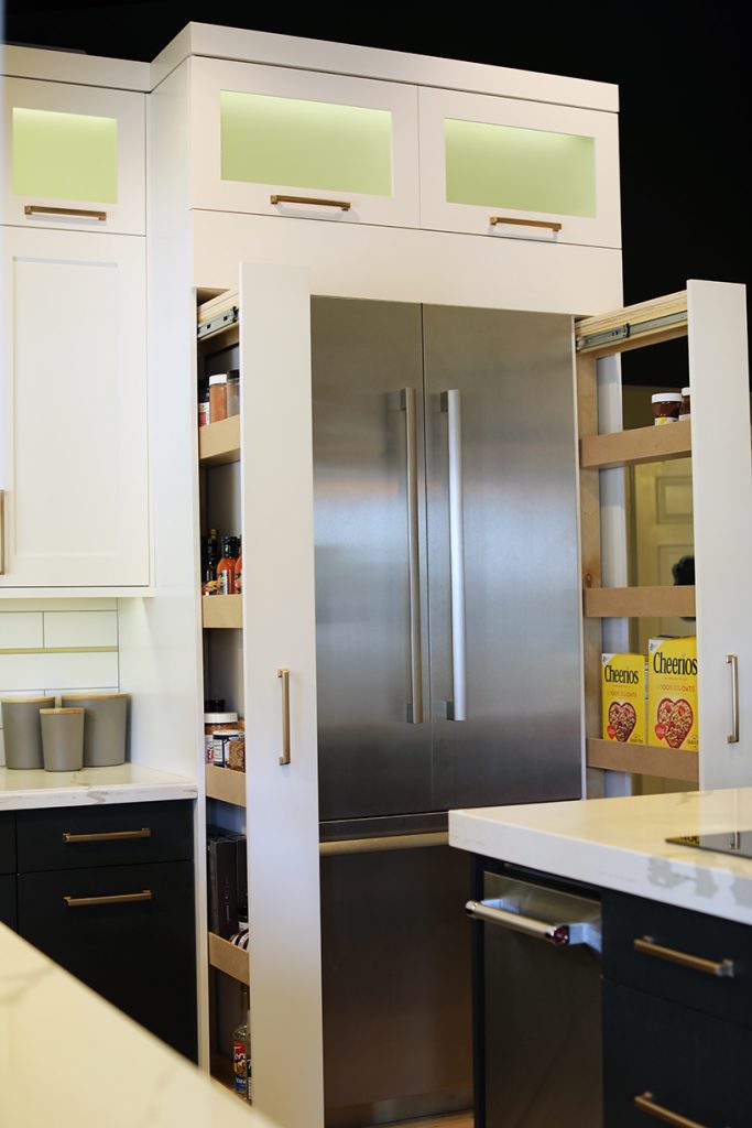 Chandler Kitchen Remodel Contractor created custom pull-outs around the Thermador refrigerator. This Remodeling picture shows the pullouts in closed position.
