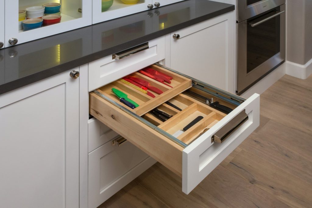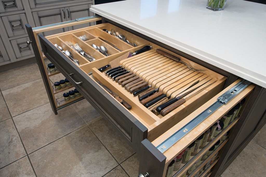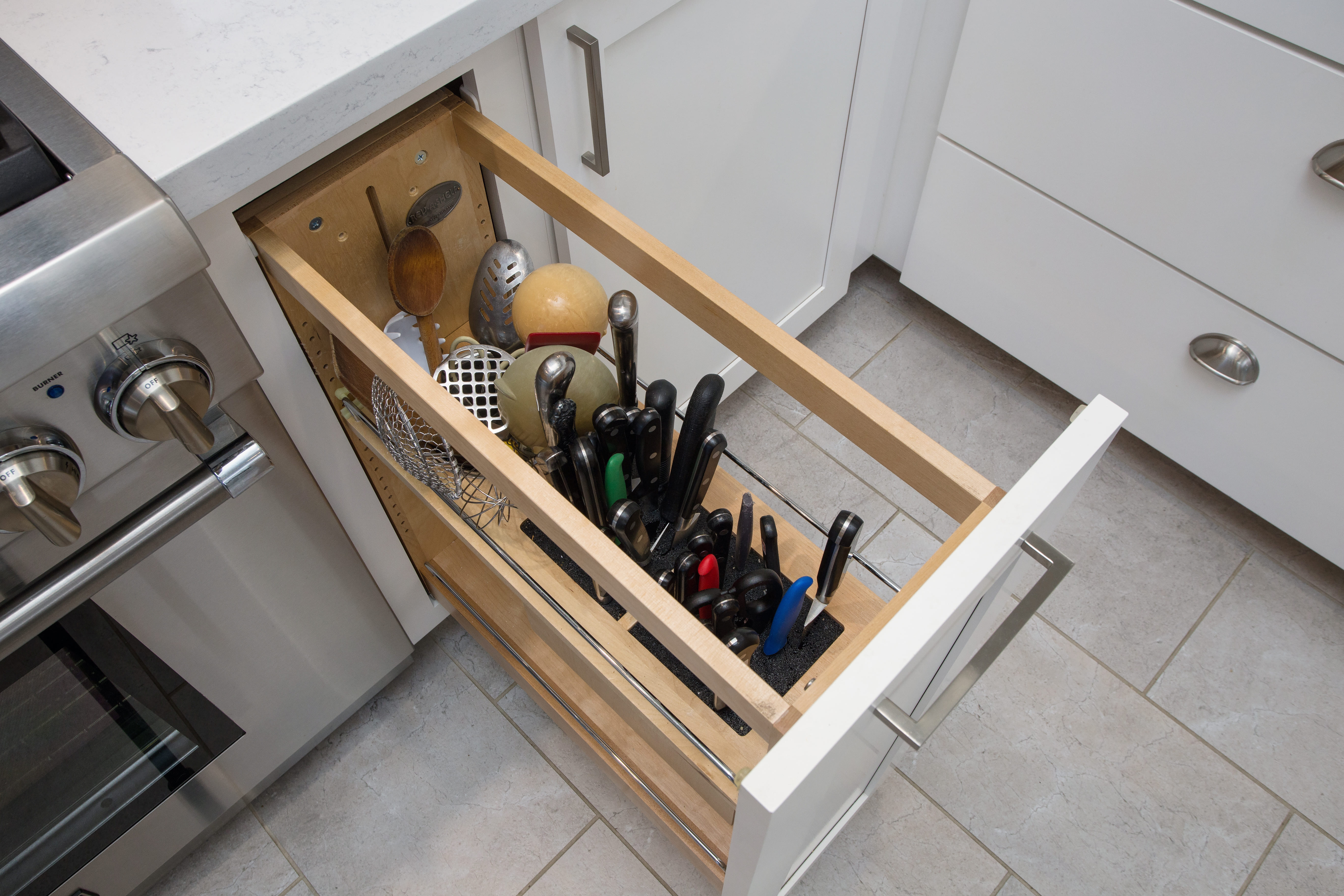 Specialty knife pull-out and filler storage solutions by Hochuli Design & Remodeling Team in the Phoenix, AZ Kitchen remodel project with quartz countertops and inset cabinets
