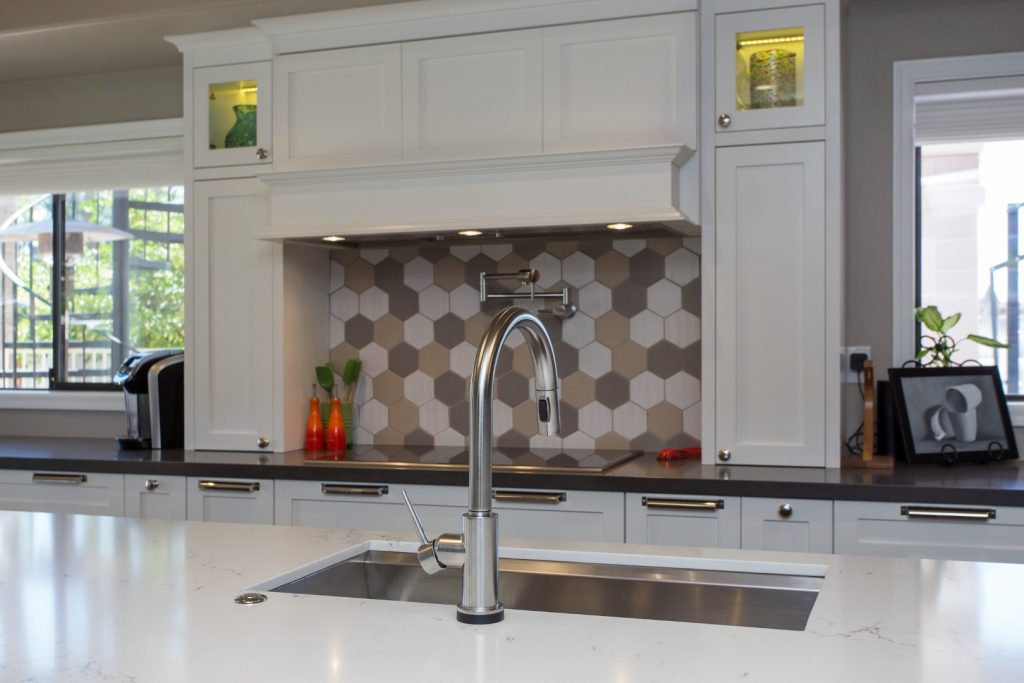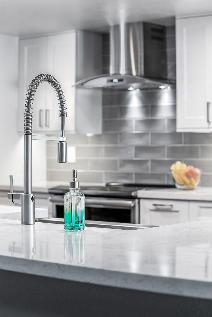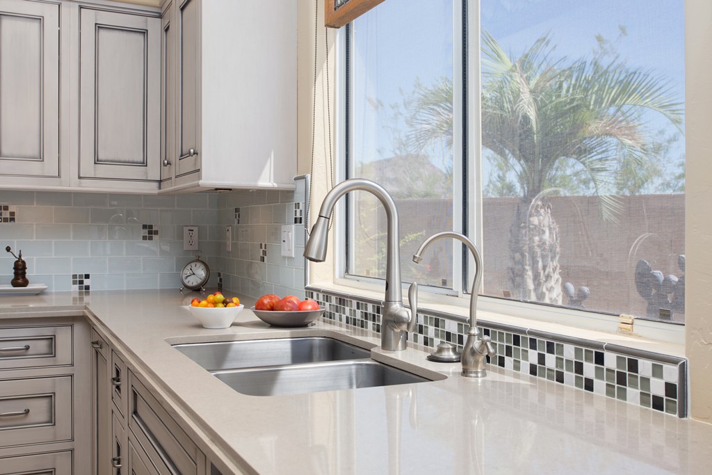 A kitchen remodel completed in Tempe shows off the Stainless finish faucet and quartz countertops