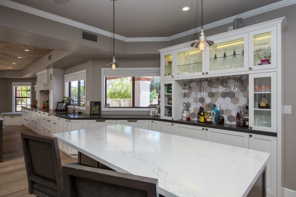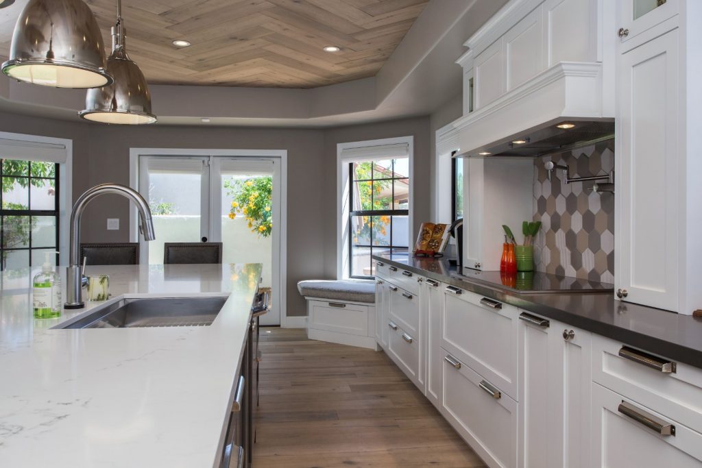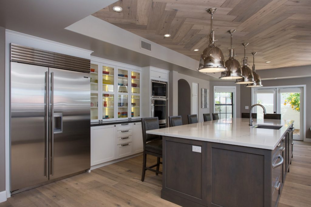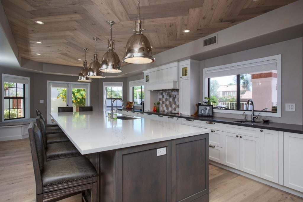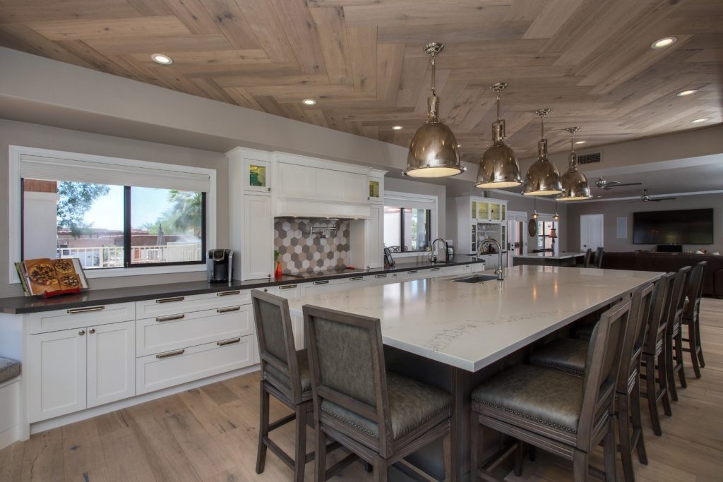 This design-build kitchen remodel project in Phoenix is complete with an over-sized island and custom features; such as the ceiling treatment.