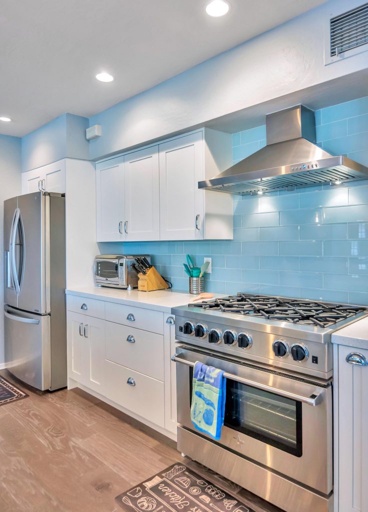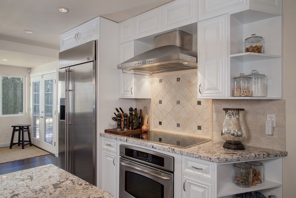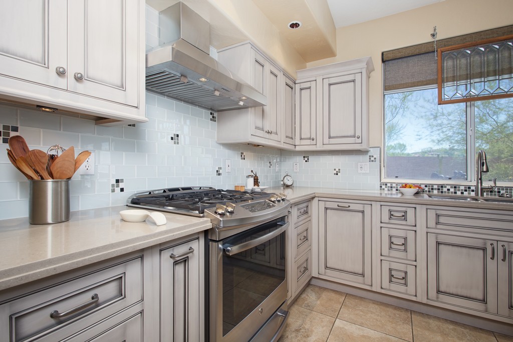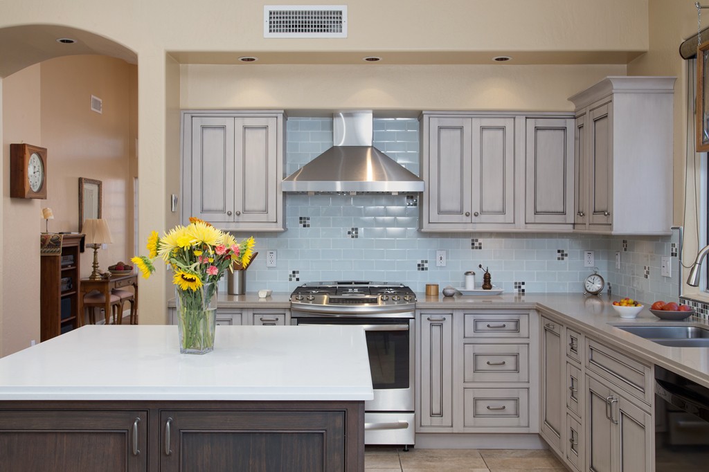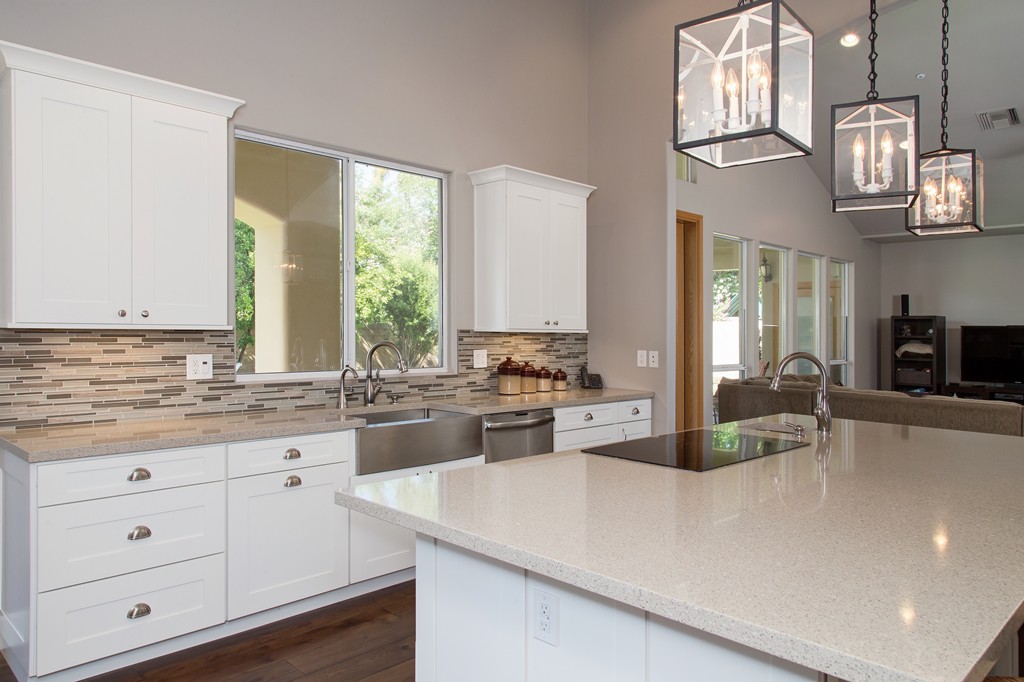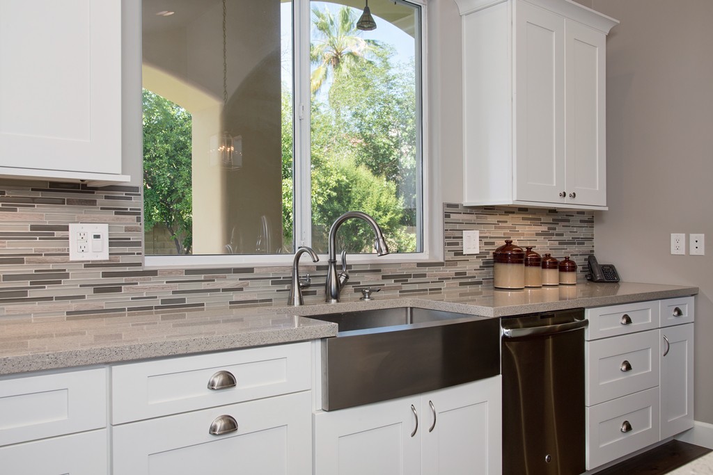 Gilbert Arizona kitchen design and remodeling project with white cabinets, glass mosaic backsplash, and quartz countertops. Completed by Hochuli Design & Remodeling Team specializing in kitchen remodeling, room additions, bathroom remodeling, interior design, interior architecture, and space planning.
