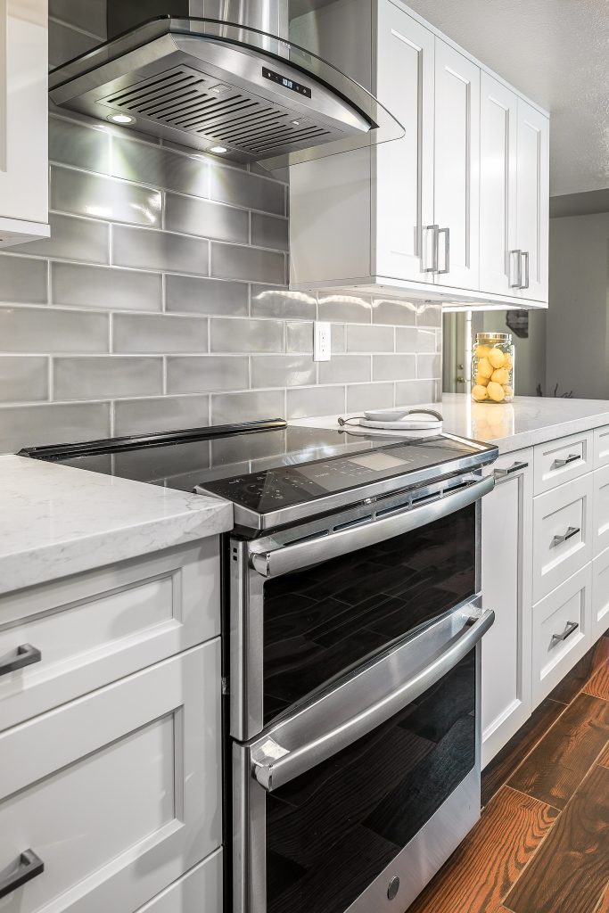 Design Build Remodeling by Hochuli Design & remodeling in gilbert, Arizona. White Shaker Cabinets, wood flooring, stainless appliances, quartz countertops, and glass mosaic tile backsplash.