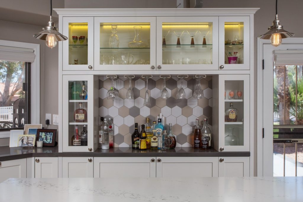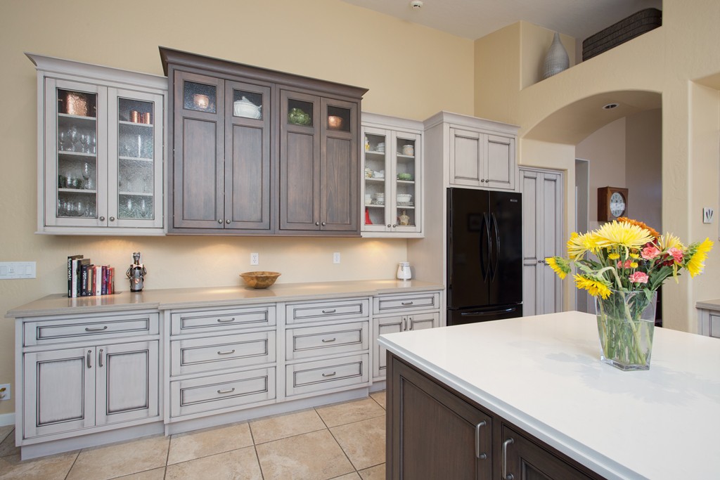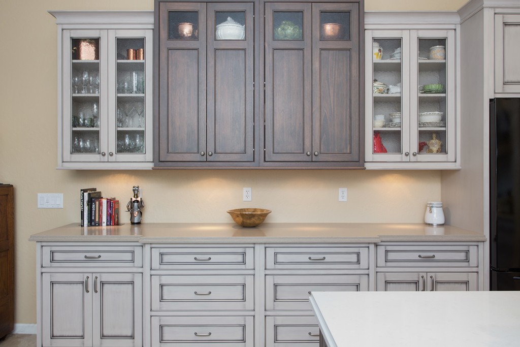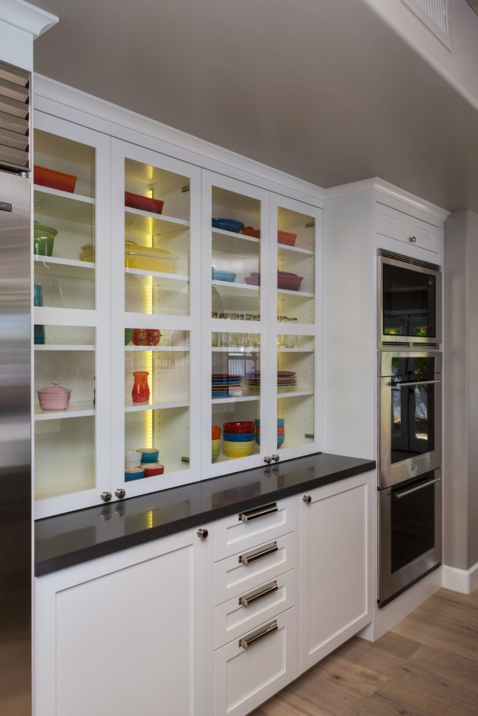 Clear glass cabinet doors and LED lighting highlight the storage in this Phoenix Kitchen Remodeling Project.
