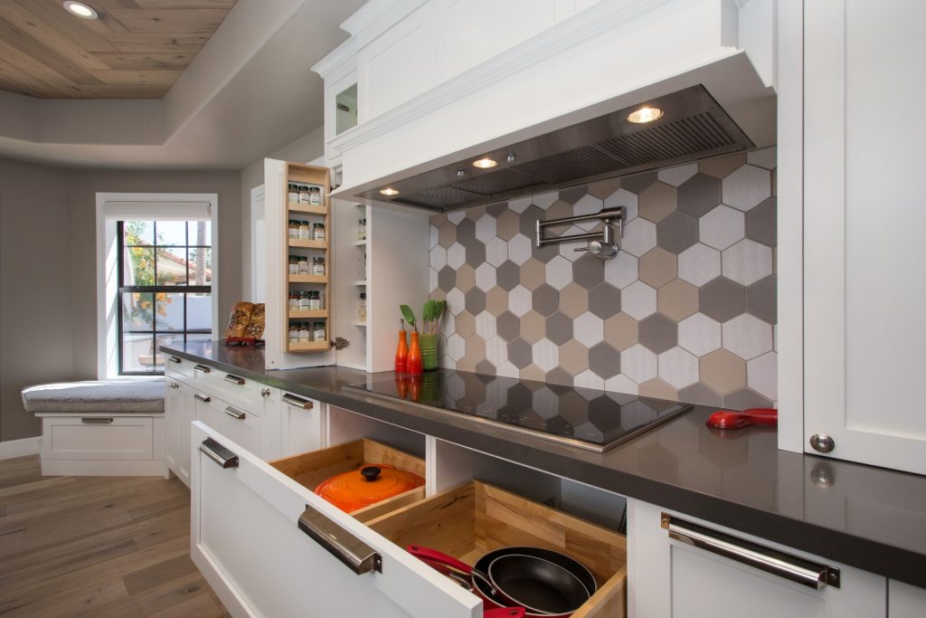 Custom features in this Phoenix Design-Build Kitchen Remodel include: Spice storage, pot storage drawers, pot filler, and a one-of-a-kind tile pattern.