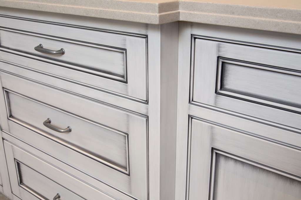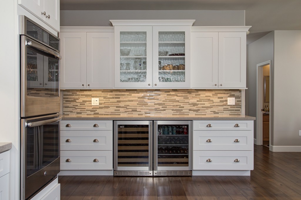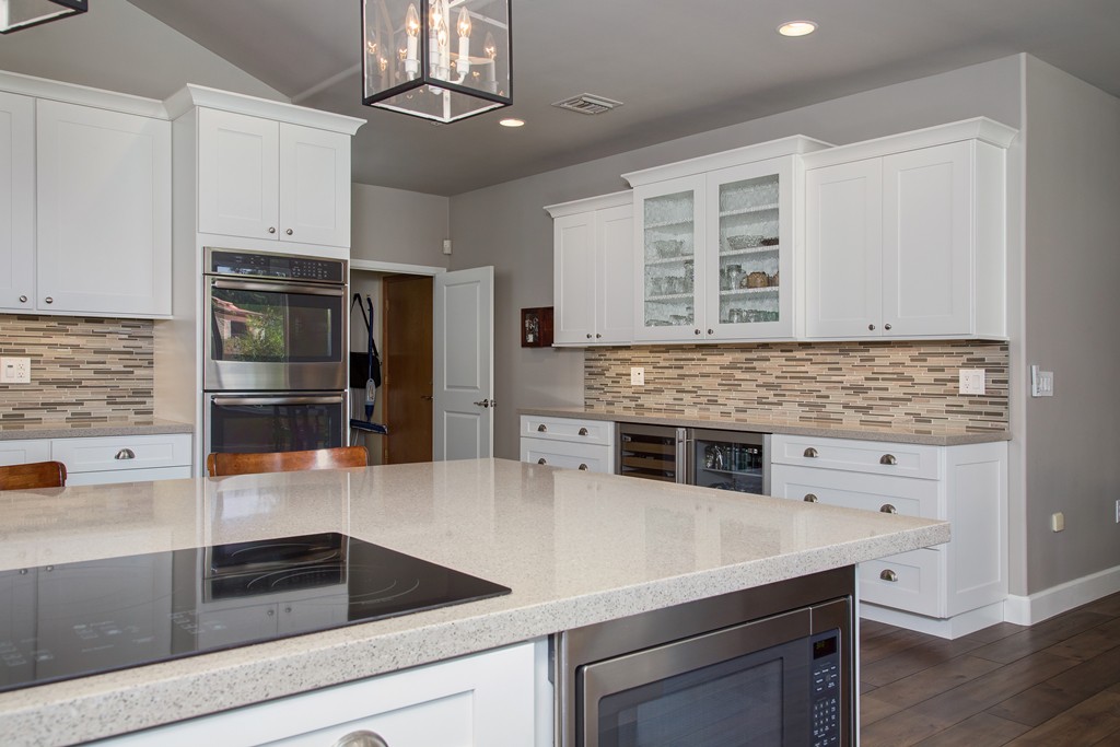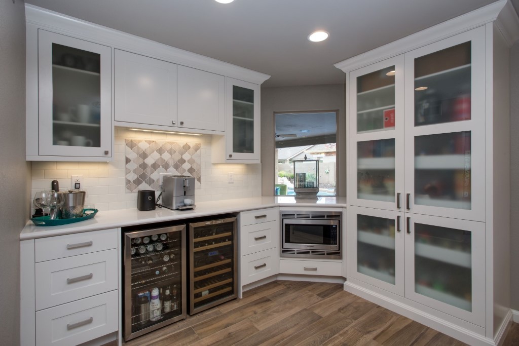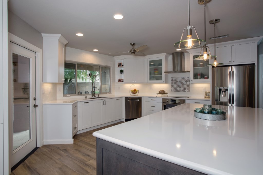 Gilbert, Arizona kitchen remodeling project with quartz counters and white shaker cabinets with obscure glass inserts