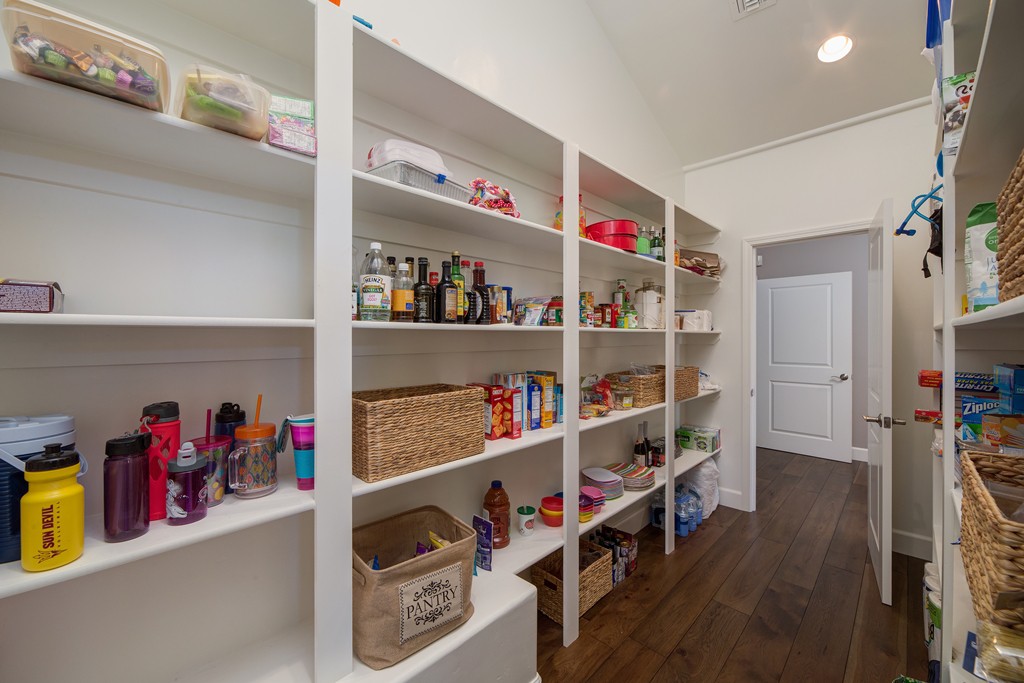 Wood flooring, white cabinets, oversized pantry closet and shelving in gilbert, az home remodeling project by hochuli design & remodeling team. Servicing phoenix, tempe, scottsdale, ahwatukee, arcadia, mesa and chandler arizona