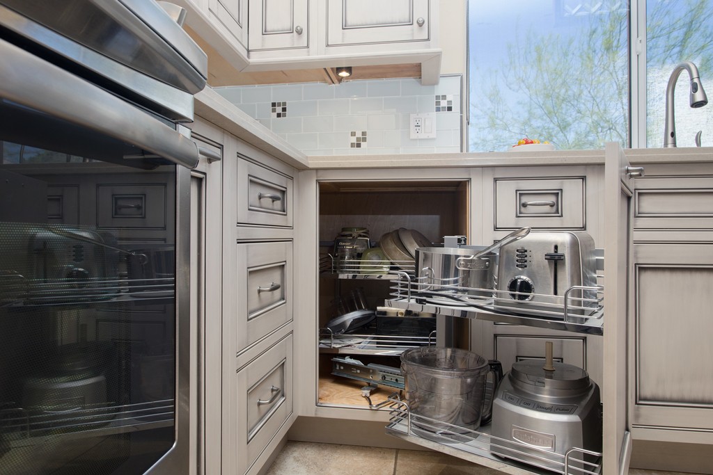 Corner pull-out storage solutions in kitchen design & remodeling project located in Phoenix, AZ. Includes Elmwood inset cabinets, quartz countertops, and glass subway tile backsplash by Hochuli Design & Remodeling Team based in Scottsdale, AZ.