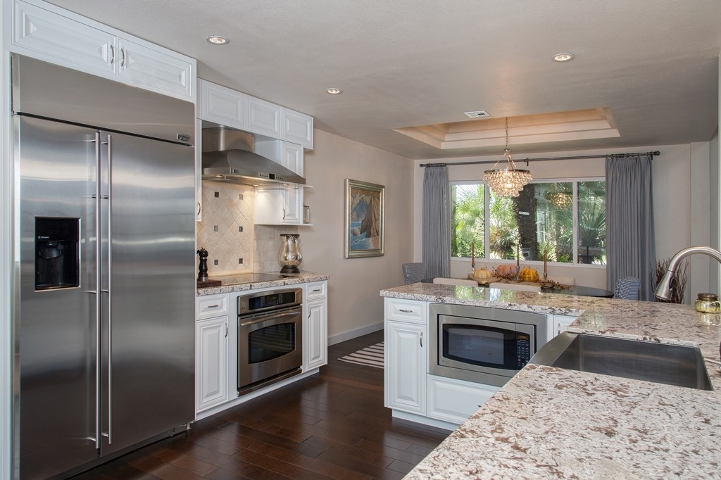 Wood flooring, granite counters, and white cabinets in this Scottsdale, AZ kitchen remodeling project. Interior Design and remodeling for kitchens, bathrooms, and room additions in phoenix, tempe, paradise valley, arcadia, ahwatukee, gilbert, mesa, and tempe arizona