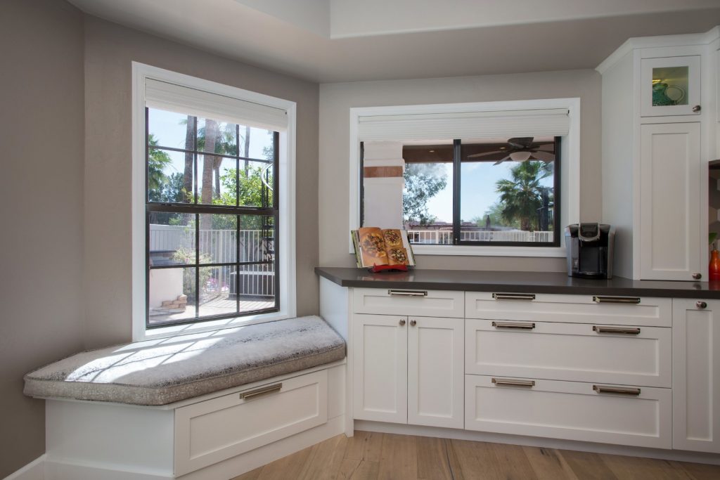 Window seats and cushions finish of this custom design-build kitchen remodel in Phoenix.