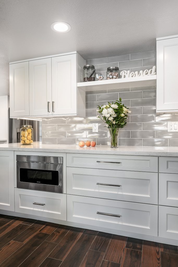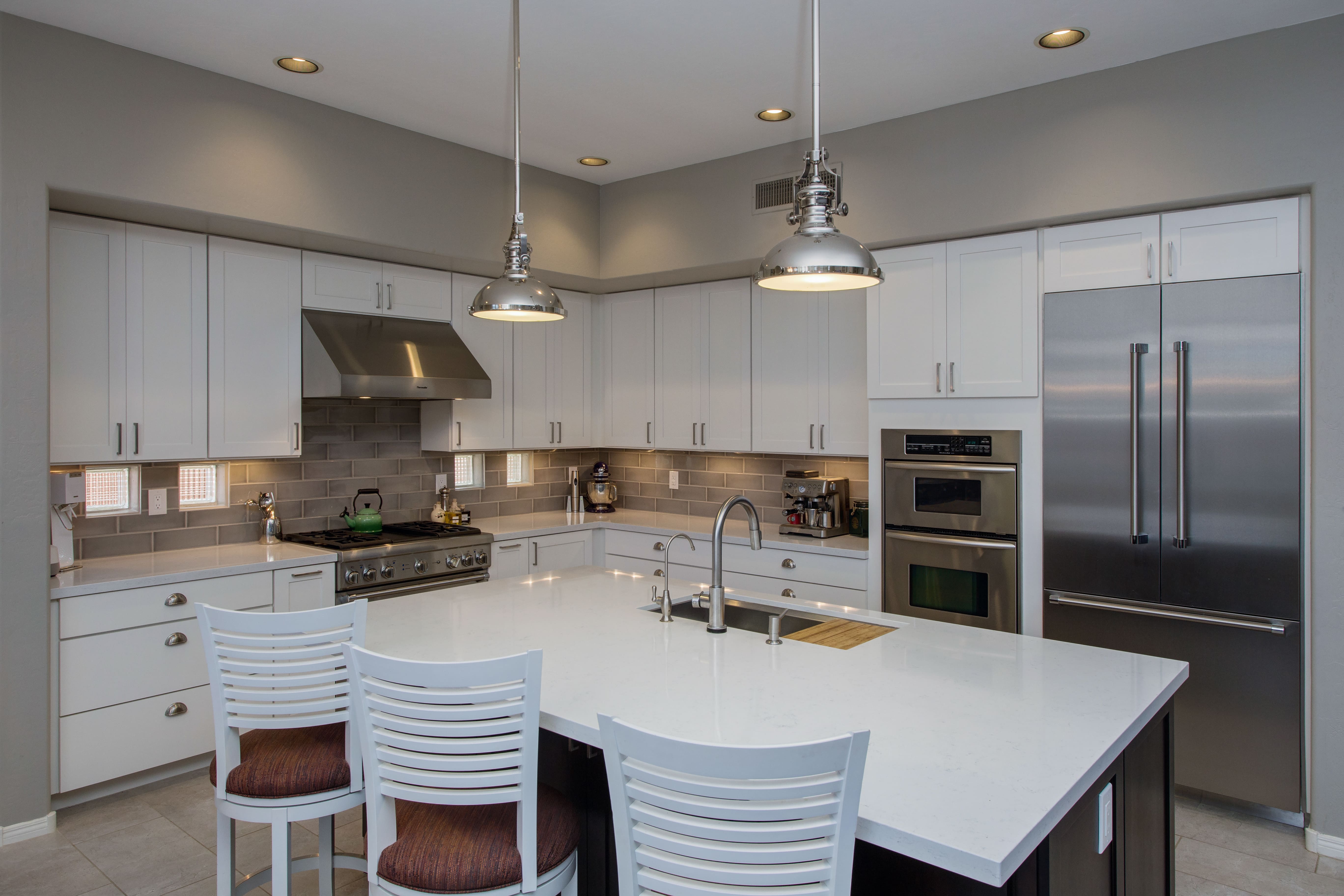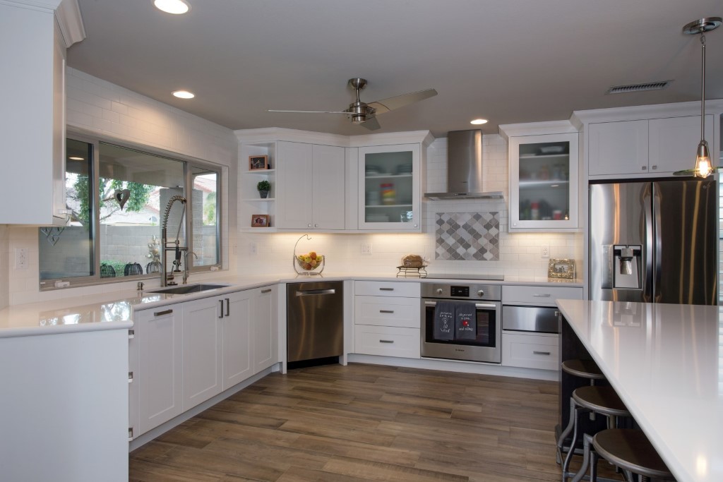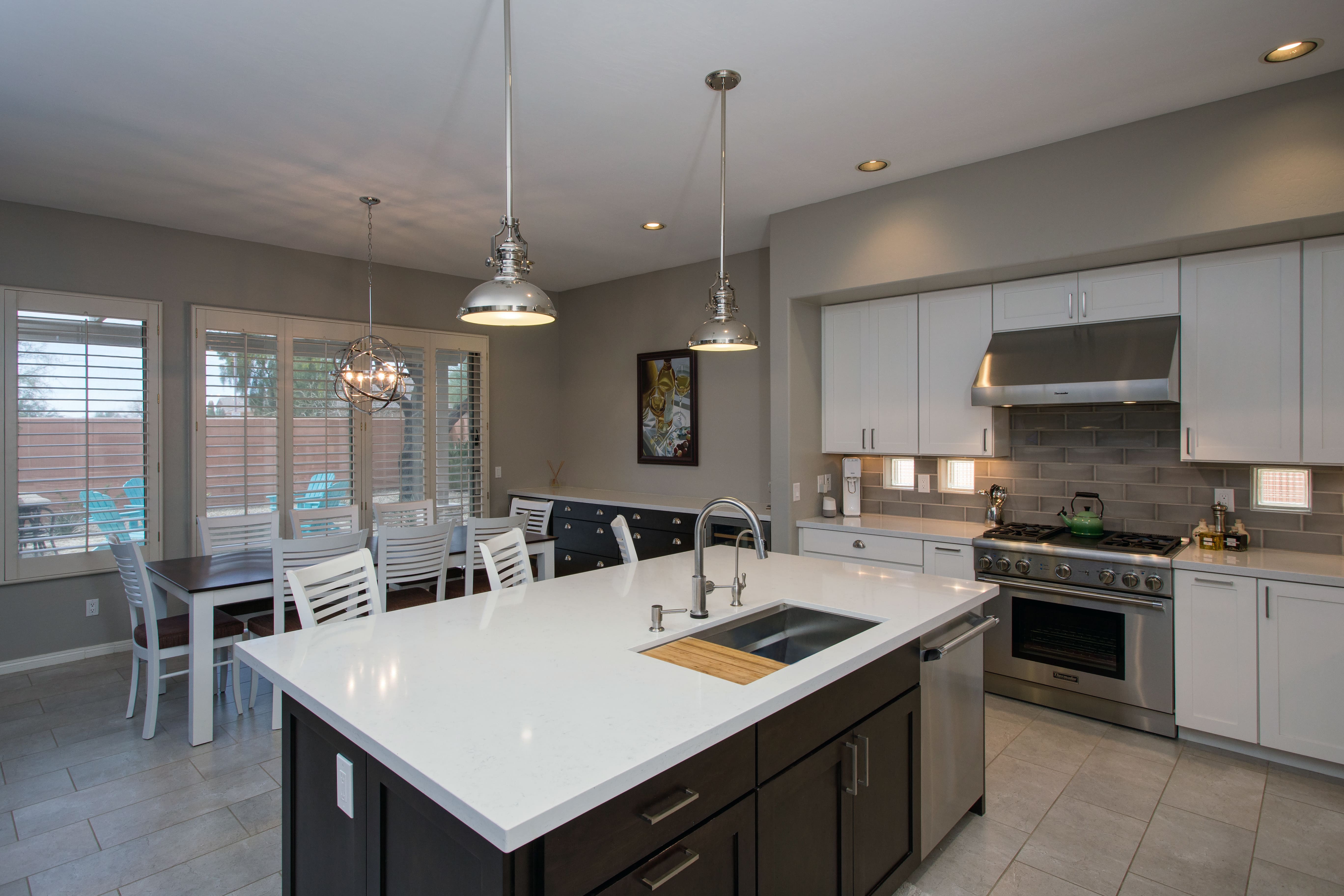 New Kitchen Design & Remodel completed in Arcadia, AZ. Finished with all new cabinets, quartz countertops, subway backsplash tile, and wood flooring