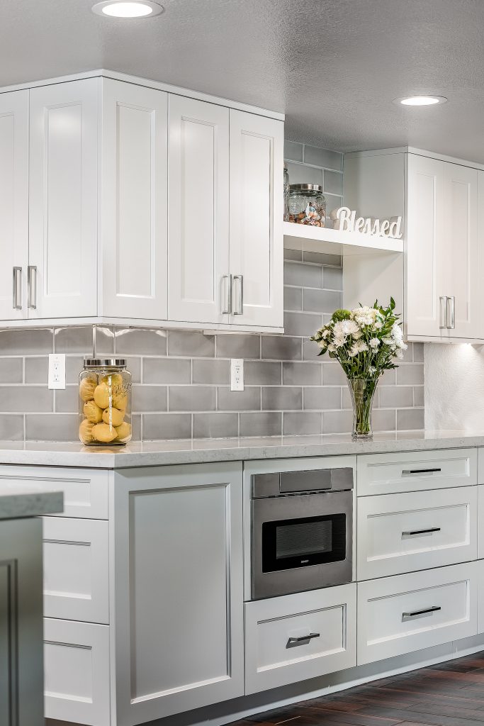 A kitchen remodel completed in tempe shows off a floating shelf from Bellmont cabinets.