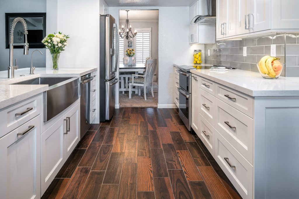 Interior Design and Kitchen Remodeling Contractor in Gilbert, AZ. This kitchen includes quartz counters, white shaker cabinets, undermount sinks, and wood flooring.