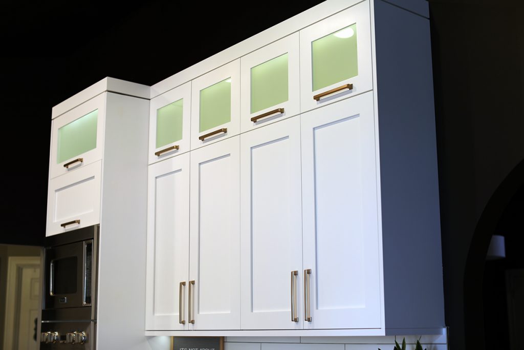 Shaker syle cabinets finished in white with upper glass doors backlit with LED lighting. Finished off with Champagne Gold Handles.