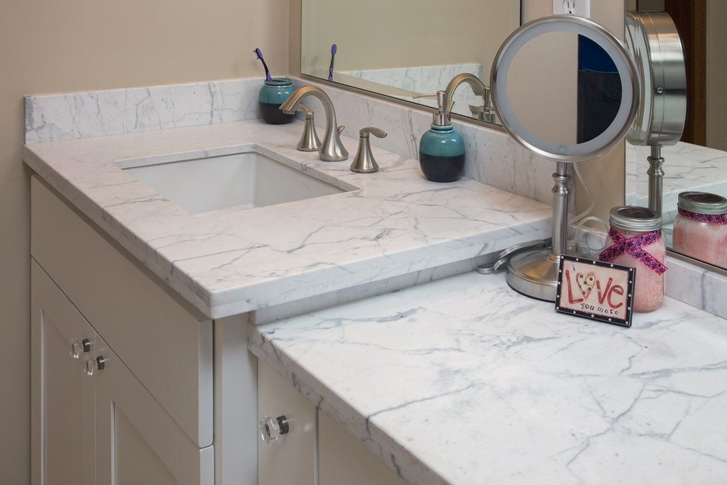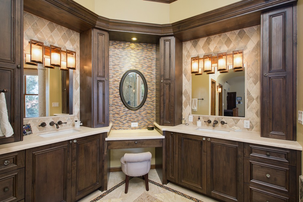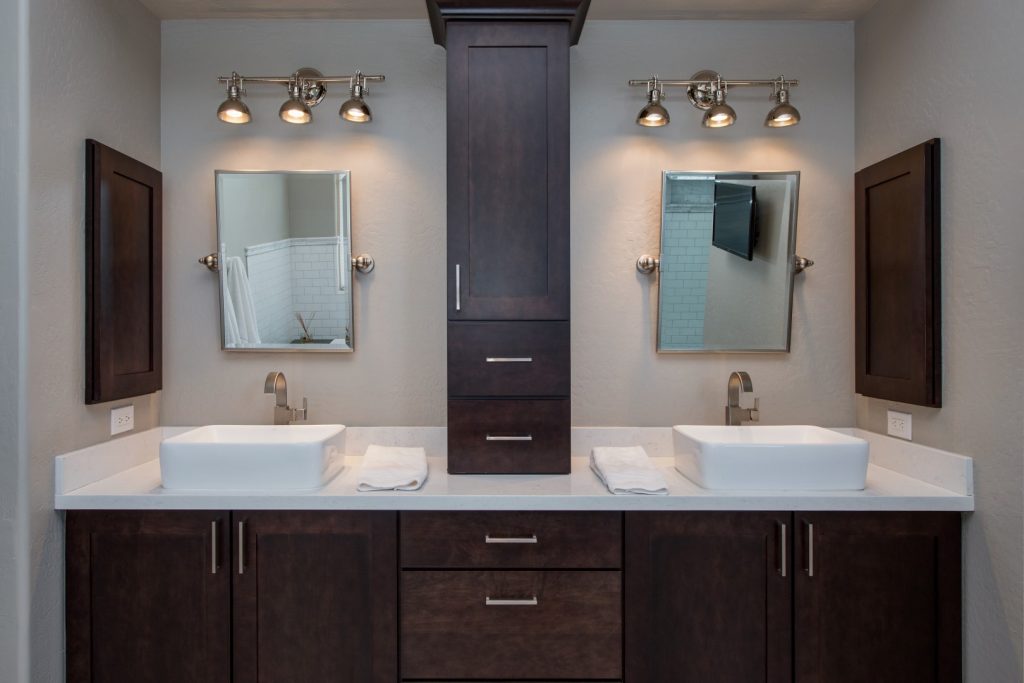 His & Her vanity areas separated by a storage tower in the master bathroom remodel project in Phoenix.