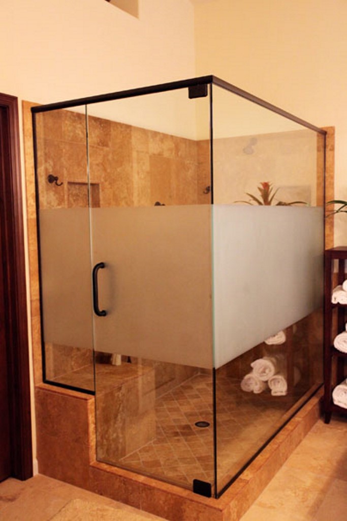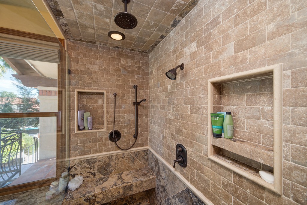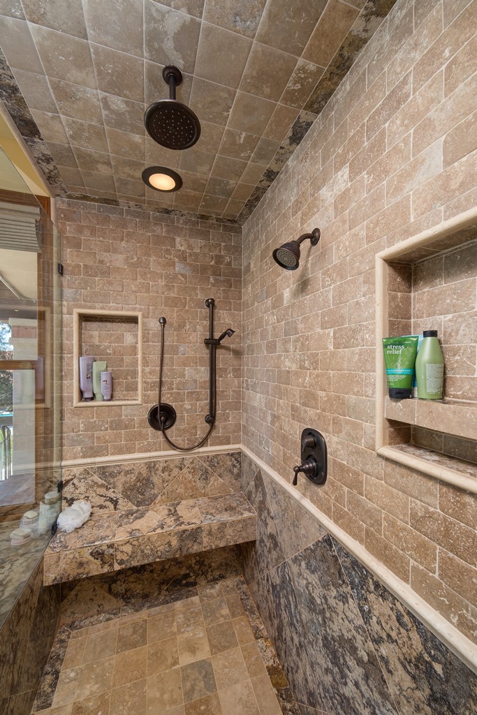 A master bathroom remodel featuring a large walk-in shower with custom tile work and frameless glass enclosure.