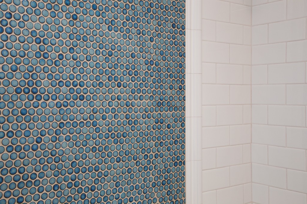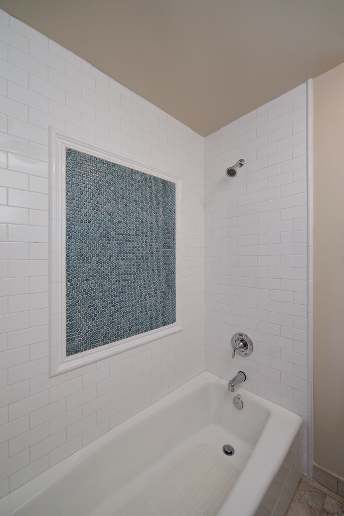 white subway tile shower with blue penny tile mosaic in-lay. kitchen and bathroom remodeling and design by hochuli design & remodeling team services scottsdale, mesa, gilbert, tempe, paradise valley, arcadia, and chandler. Room additions, general contracting, and interior designer