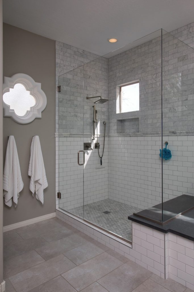 This master shower renovation in Phoenix features subway tile with a custom shower floor tile.