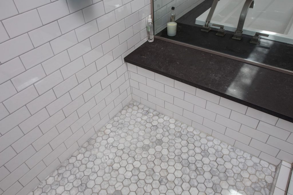Custom tile layout with white subway tile in this guest bathroom remodel in Phoenix.