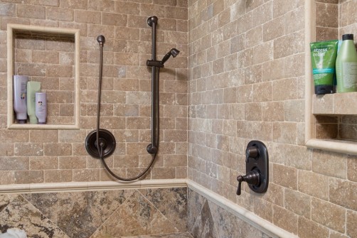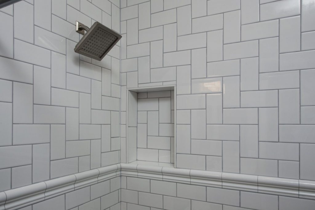 Custom subway tile pattern with shower niched in custom shower remodel in Phoenix.