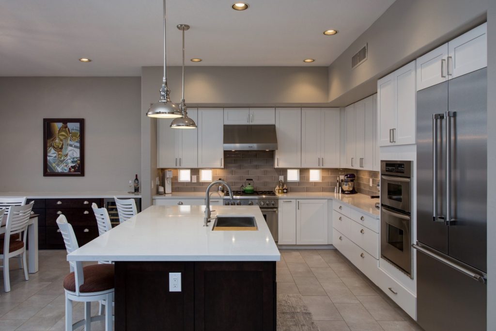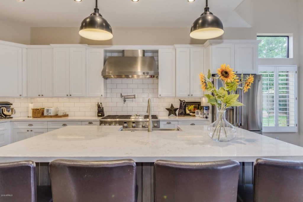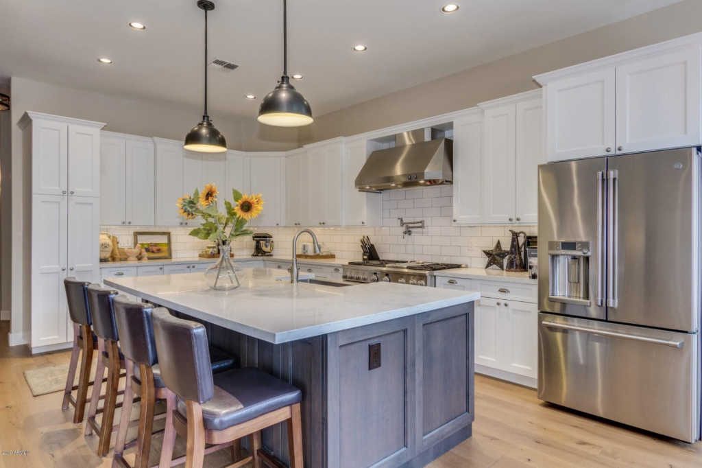 White kitchen cabinets with white quartz countertops and custom island cabinets in this Phoenix Kitchen Remodel.