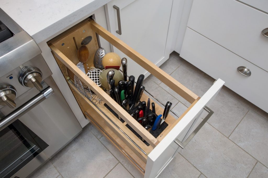 Knife storage pull-out in this design/build kitchen remodel in Phoenix